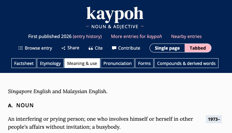 The word ‘kaypoh’ was first used in 1973 and is a loan from Chinese.
